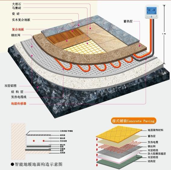 電地暖的發(fā)熱體主要是發(fā)熱電纜。發(fā)熱電纜的工作原理是將特制的發(fā)熱電纜敷設(shè)于房間地面構(gòu)造層內(nèi),當(dāng)發(fā)熱電纜通電后,其工作溫度是40-60℃條件下,將電力能源轉(zhuǎn)化為熱能,通過(guò)地面作為輻射散熱面,把熱量主要以輻射傳遞至房間而達(dá)到供暖目的供暖方式,發(fā)熱電纜供暖系統(tǒng)中,電能轉(zhuǎn)換為熱能熱效率可達(dá)99%以上,其中輻射換熱量約占總換熱量60%以上。